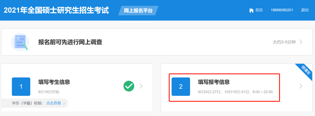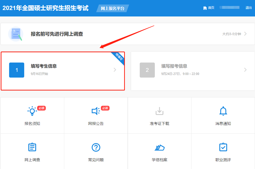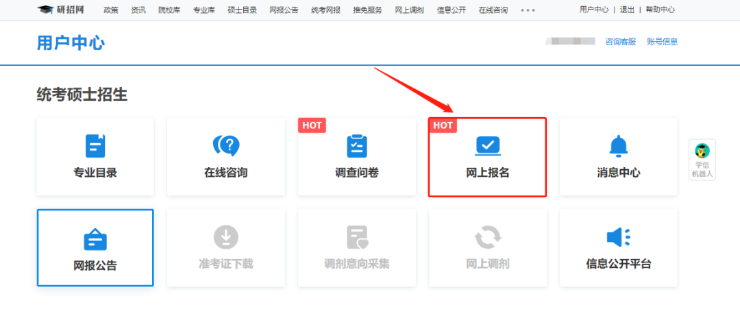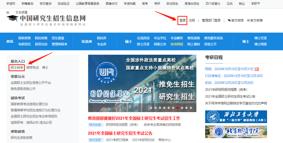 (1)登录中国研究生招生信息网,选择考生注册(无账号)或者登录(往届有账号)入口