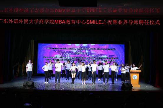 晚会在红红火火的《喜庆欢歌》中拉开帷幕,商学院院长朱文忠教授为本次晚会致辞。他提到,广外MBA始终践行“社会责任(Social Responsibility)、尊重包容(Mutual Respect)、正直诚信(Integrity)、知行合一(Learning by Doing)、创业精神(Entrepreneurship)”的“SMILE”价值观,在学校领导及社会各界的大力支持下,通过了AMBA国际认证和再认证,而这几年成就的取得,离不开每位领导、老师和同学的不懈努力。双导师制的施行必将为广外MBA教育注入更多活力,广外MBA定会在各界人士的支持下变得更强大、更优秀。