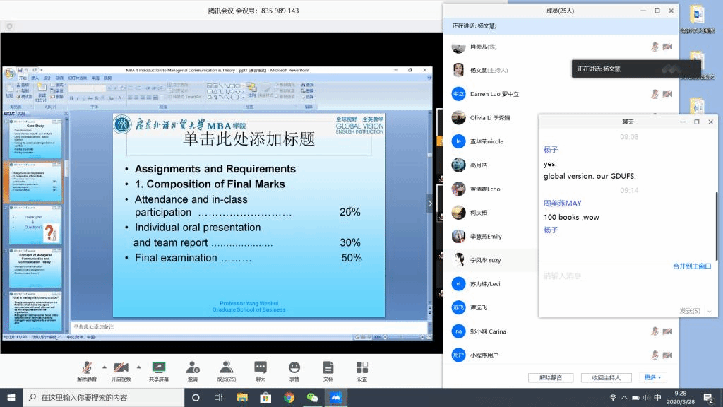 3月28日是广外MBA全面开展在线授课的首日,共二百余MBA师生通过雨课堂、慕课堂、Blackboard、Webex、腾讯会议等平台顺利完成了九门课程的在线学习。包括身处于美国夏威夷的外籍教师、身处于国外多地的MBA留学生,和正在进行隔离的刚结束国外游学项目的MBA学生,全体师生共同克服时差等不便因素,迎难而上,坚持完成在线课程的授课和学习。多门课程的任课教师根据MBA教学的特色,制定了多平台综合授课的教学方案,使用多种不同的平台工具丰富教学的多样性,提高教学的成效。MBA在线授课首日结束,同学们反馈热烈,好评如潮,没有了未开课前对于在线授课教学质量及其形式的质疑和不安,对任课教师的在线授课素质和授课质量表示充分的肯定。