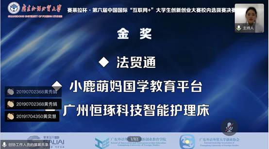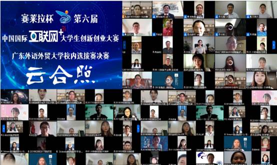本次大赛由教育部和广东省人民政府等单位共同主办,华南理工大学、广州市人民政府和深圳市人民政府承办,经过院级层层选拔,共有15支创业团队参与校级决赛。比赛首次采取线上“云路演”方式,评委由副校长、创新创业教育学院院长刘海春教授,全国政协委员、中国科协委员、广州赛莱拉干细胞科技股份有限公司董事长、广东外语外贸大学创新创业导师陈海佳博士,学生就业指导中心主任、创业学院常务副院长康为茂以及“互联网+”国赛团队成员组成。