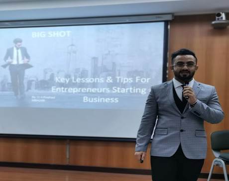 来自20B班的留学生Rashad为大家带来了“创业者创业的关键经验和提示”的分享,Rashad所经营的公司主营厨房设备生产及国际进出口贸易,目前在也门、中东、广州开设了多家分公司。他结合自身多年在中国的业务经验,向同学们分享了身为一个年轻创业者应具备的企业家特质以及在如何选择行业和产品、公司名称等方面给出了实用的建议。