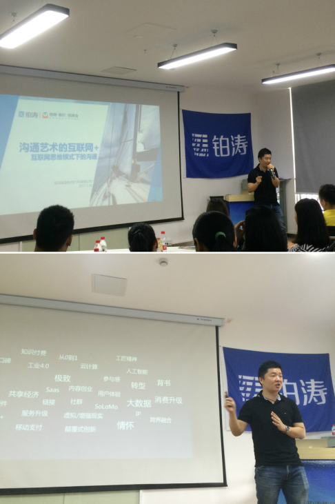 参观完办公室后,营销运营研发中心高级总监Jason在八楼会议室和同学们进行了一场关于互联网思维模式下的沟通的探讨。这次探讨分为三个部分:认识当前互联网思维下的产业现状和发展趋势、互联网公司的沟通方式和互联网沟通实战案例分析。Jason向同学们提出了“+互联网”的概念,即通过互联网改善产业结构。特别是在第二部分中,Jason从企业的扁平化组织架构、提升沟通技巧和无授权领导力三方面向同学们讲解互联网公司的沟通方式,用腾讯和小米的案例形象展现了扁平化组织结构,对沟通技巧提出三大原则和七个突破口并一一讲解。Jason用他的耐心和细心给同学们上了一节生动的沟通课,使同学们受益良多。最后,Jason用铂涛互联网员工奖励实战案例对沟通方式选择的重要性进行分析。