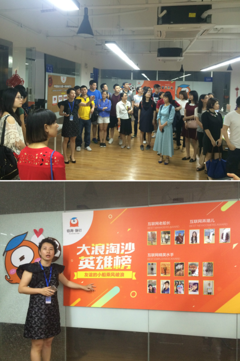 接着,Susan带领大家参观了铂涛互联网公司的办公室。从办公室的摆设、装潢以及分布,同学们感受到了铂涛集团的年轻化、人性化。Susan向同学们介绍了办公室内的电商平台业务墙、员工英雄榜、书架、集团员工活动纪念墙、薪火计划等等,无一不在传递着铂涛的管理理念,使同学们受益匪浅。