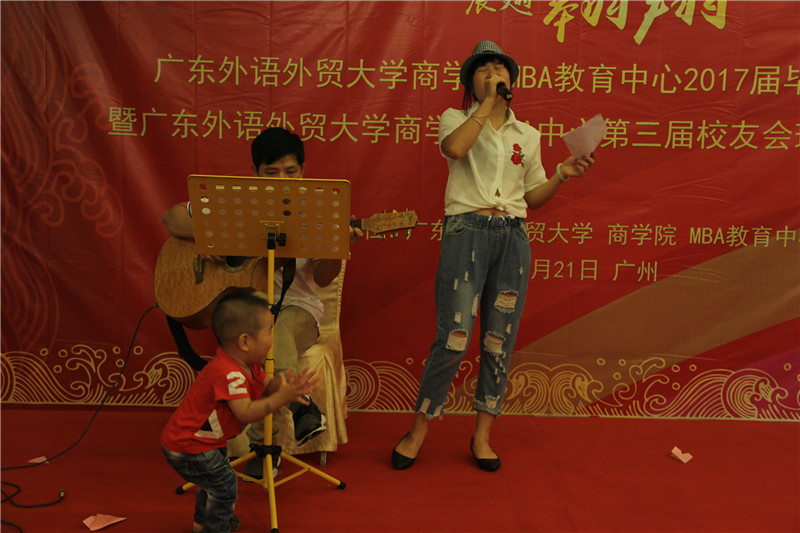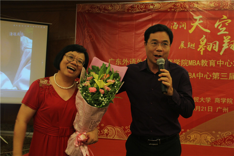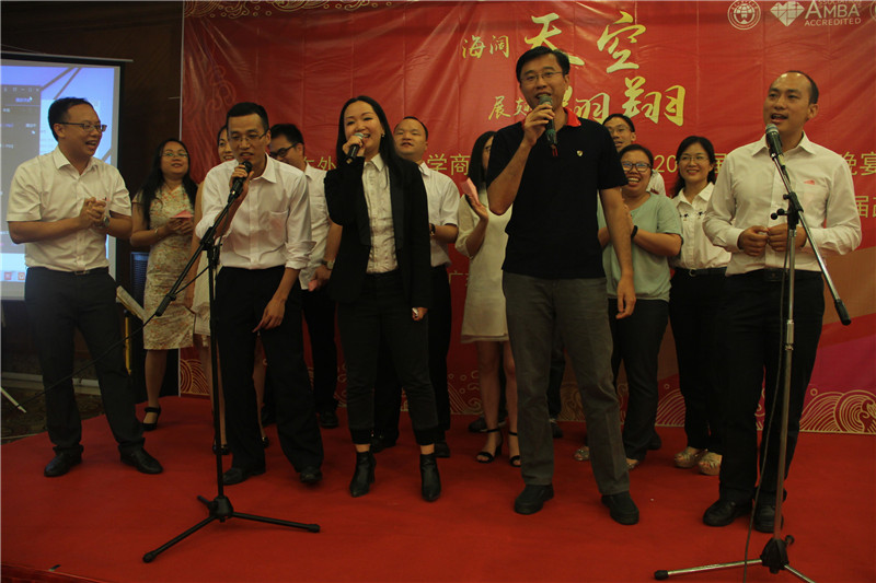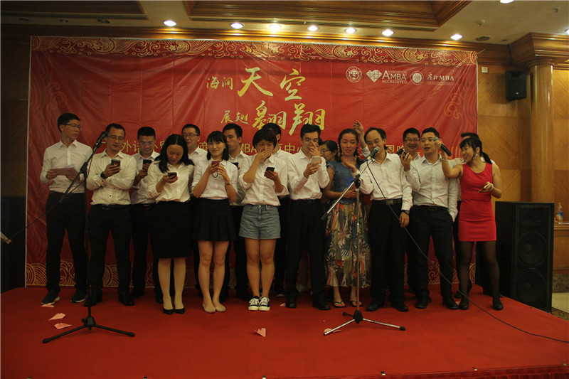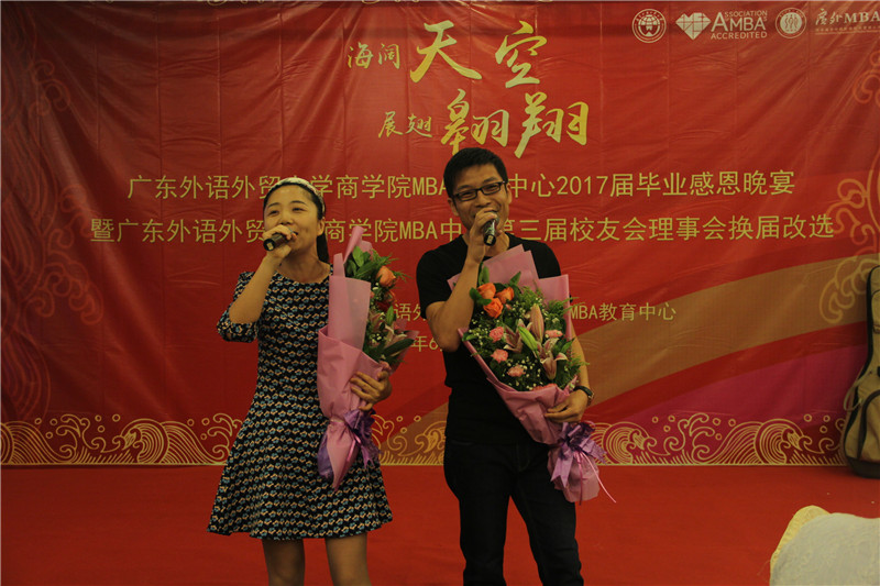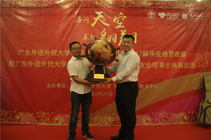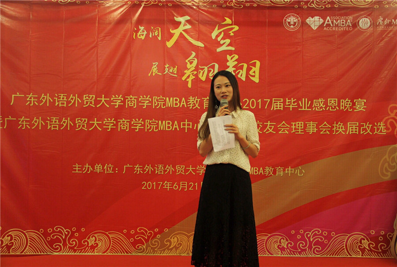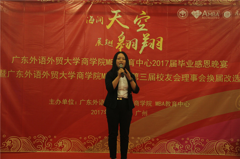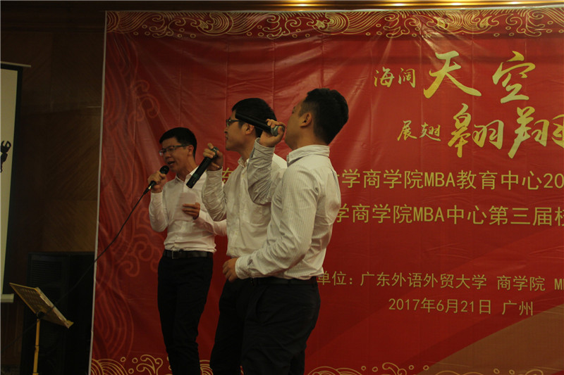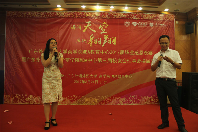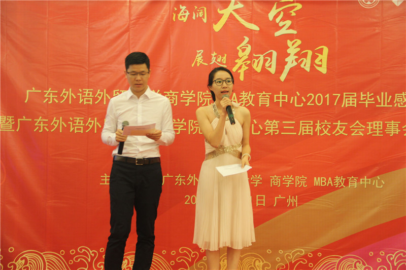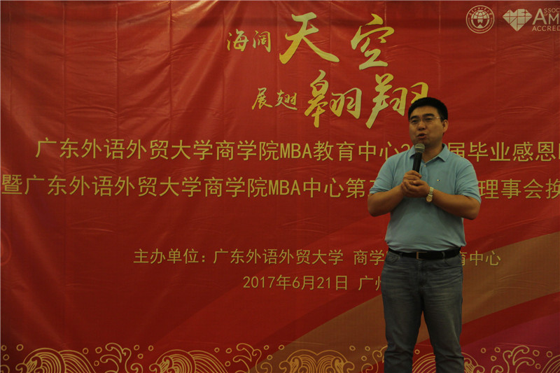 海阔天空,展翅翱翔,6月21日晚,广东外语外贸大学商学院MBA教育中心2017届毕业晚宴暨广东外语外贸大学商学院MBA中心第三届校友理事会换届改选活动于鸣泉居隆重举行。商学院院长朱文忠、党委书记植秀聪、副院长袁登华、梁洁、邱伟年、党委副书记罗海洋、MBA中心主任王刚、广东外语外贸大学校友总会副秘书长毕建永、MBA办公室老师、MBA授课老师、MBA各级毕业校友、在校学生代表与2017届毕业生们欢聚一堂,在离别之际,回忆往昔,畅想未来。