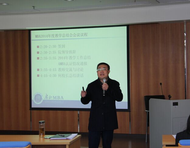 在总结2014年教学工作时,袁登华教授回顾了课堂教学、毕业论文和实践教学开展的基本情况,向老师们反馈了教学评估结果。他说道,教学评估结果表明,教师的专业水平、教学准备、教学材料和师生互动等方面都得到学生的充分认可,在作业反馈方面需要加强,在教学方法方面还有进一步探索的空间,教师应当投入更多的时间和精神了解雇主和学生的需求,提高教学内容的适用性。在实践教学方面,移动课堂、知行周、新视野讲座、创新创业论坛等都开展得卓有成效,MBA移动课堂已经从境内走向境外。