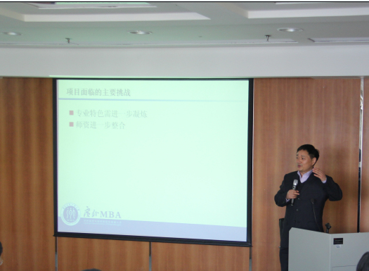 谈到AMBA认证进展时,袁登华指出,去年10月份,MBA教育中心已顺利通过AMBA预认证,今年3月下旬将迎来正式认证。他还从战略与机制、国际化、课程设置、教学方法与实施等方面,对AMBA认证专家的意见进行分类解析。例如,在国际化方面,我院将从与我校合作的200多所院校中,筛选出18所知名商学院,进一步开展深入合作,为MBA学生提供更多和国际交流项目,让更多的学生在国际交流中受益。在教学方面,将更加重视培养学生的创业精神以及社会责任感。针对学生论文写作存在的问题,将会开设相关课程来加强指导,提高学生商业调研和统计分析能力。此外,在教学设施方面,网络学习平台的建设会进一步推进,学院还将着力打造开展实验教学的专属实验室。