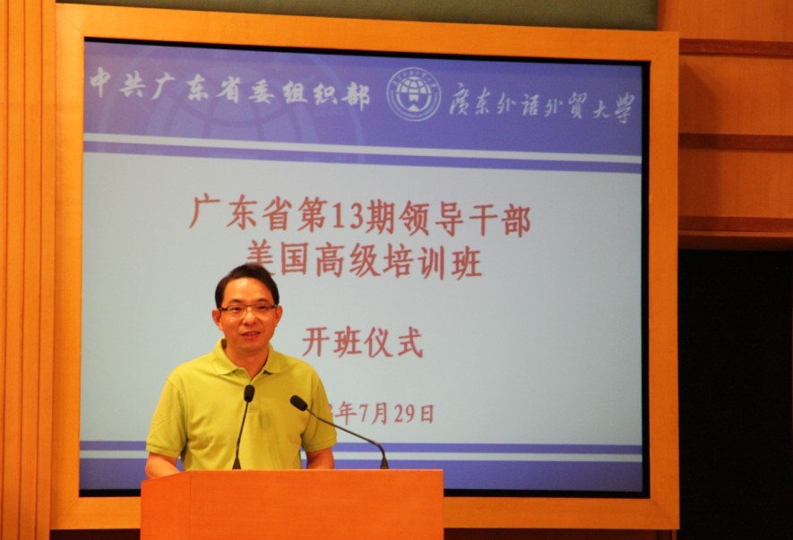 7月29日下午,广东省第13期领导干部美国高级培训班开班仪式在我校北校区国际会议厅举行。省委组织部副部长张辉、省政府外事办公室副主任苏才芳、省财经厅纪检组长、党组成员邓桂明,我校党委书记隋广军、副校长方凡泉等领导出席了活动。仪式由省委组织部部务会成员、副厅级组织员陈文明主持。