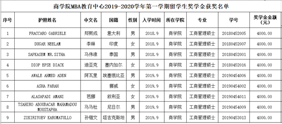 根据《2019—2020学年第一学期广外商学院MBA留学生奖学金评选通知》、《商学院MBA教育中心留学生奖学金评审工作办法》有关要求,经MBA留学生本人申请、广东外语外贸大学商学院留学生奖学金评审委员会审定,共评选出2019-2020学年度第一学期商学院MBA教育中心留学生奖学金获得者9名,现将名单予以公示。